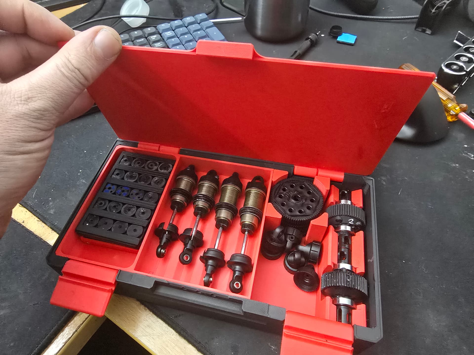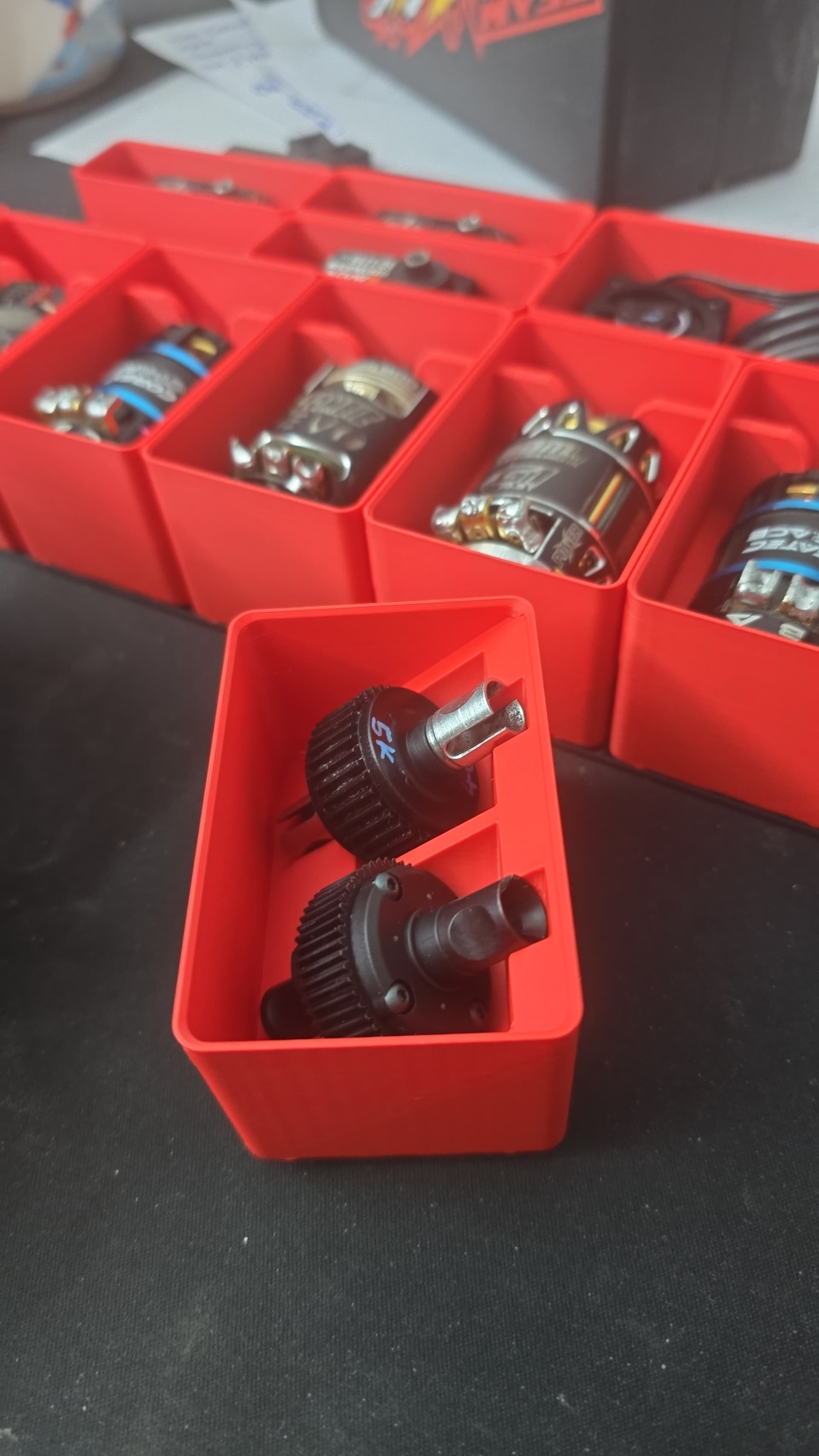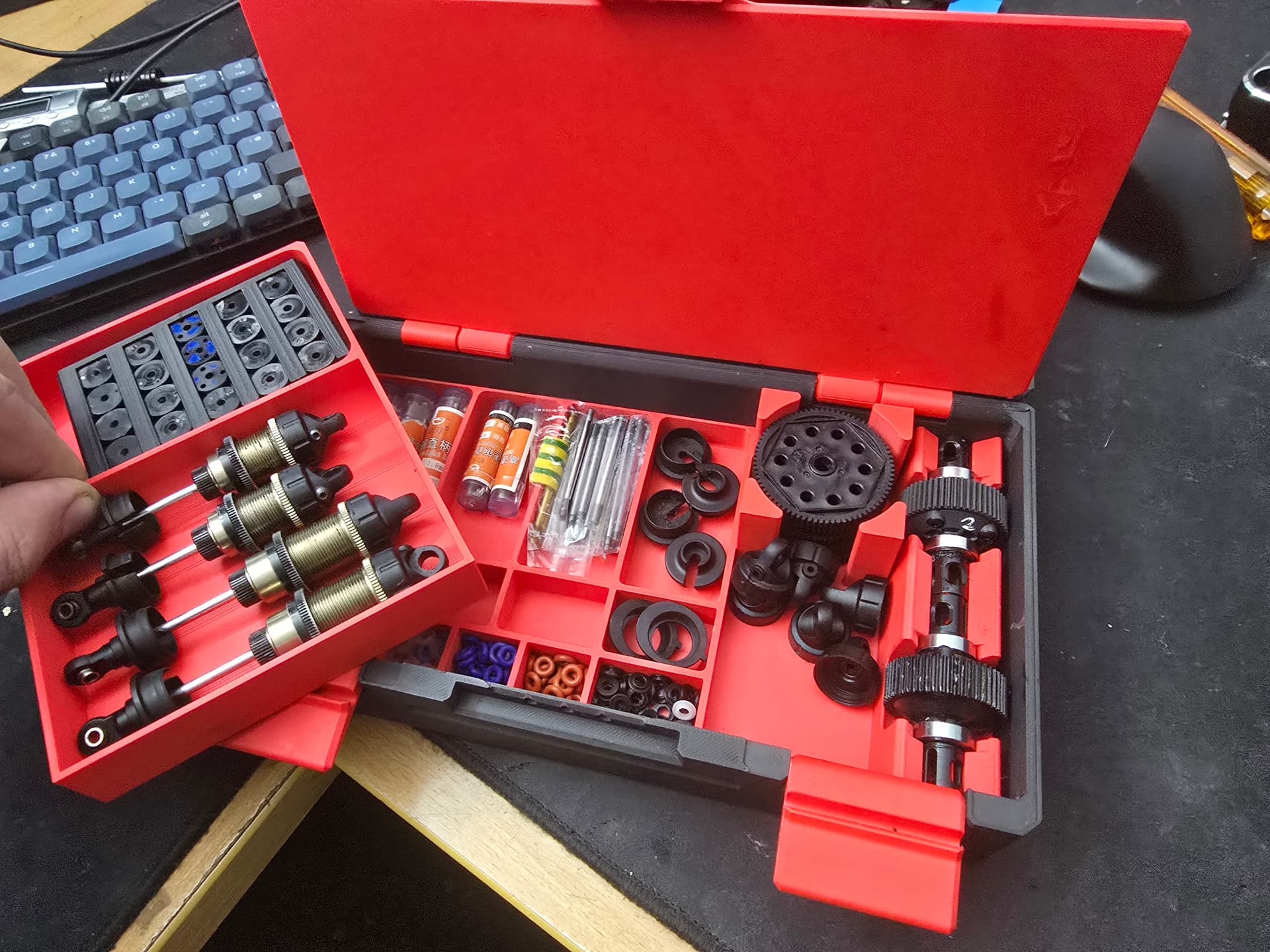 Idea is to carry all tuning parts for 1 car, inc spare diffs, shocks, spurs, pills , pistons, springs etc.