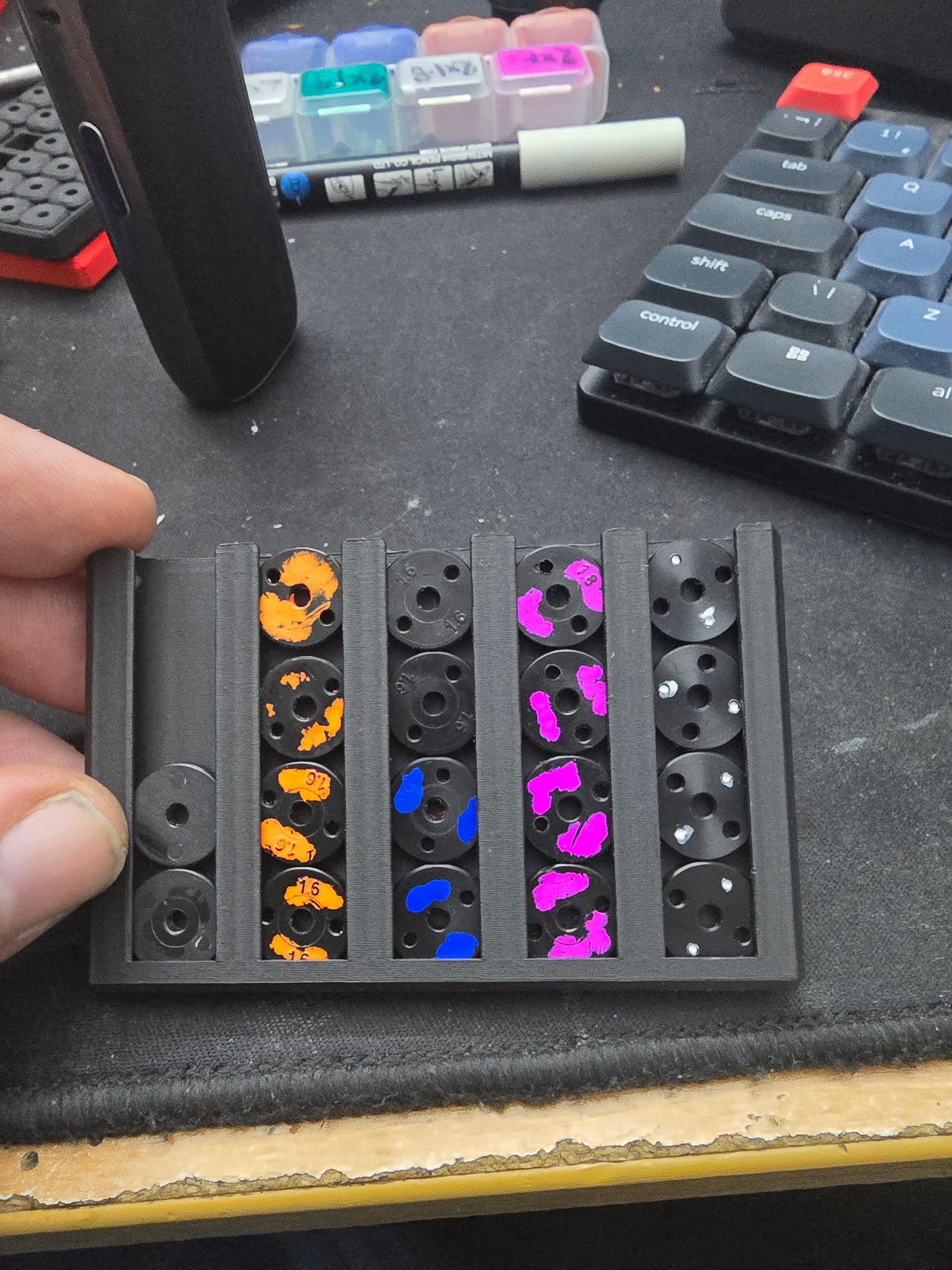 I colour code my pistons for size of holes, and the card has the sizes printed into it. The card is double sided, so i put pistons with 2 holes on one side, and 3 holes on the other. Its tidied up my piston storage quite a bit